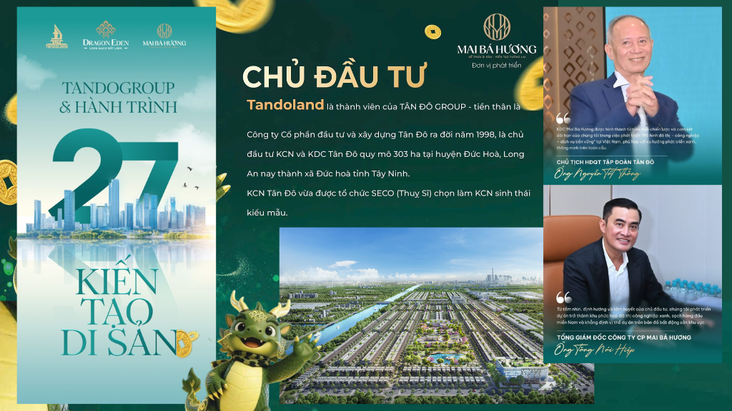 Lấy cảm hứng từ Biểu tượng Rồng Tado, dự án đất nền Dragon Eden không chỉ đánh thức long mạch đất lành, mà còn khơi dậy sinh khí thịnh vượng cho cả khu vực. Đây sẽ là đô thị năng động – bền vững – tiên phong của Long An, nơi hội tụ tinh hoa kiến trúc, quy hoạch và giá trị sống thời đại mới.